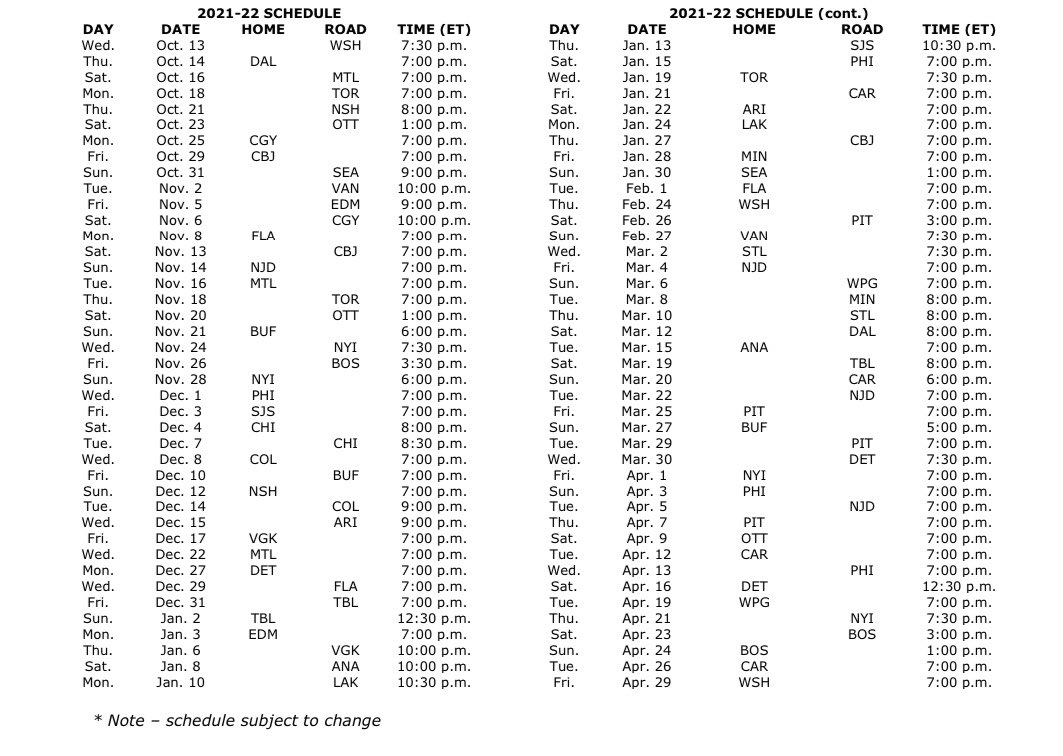 Nhl Announces Updates To The Capitals Regular Season Schedule